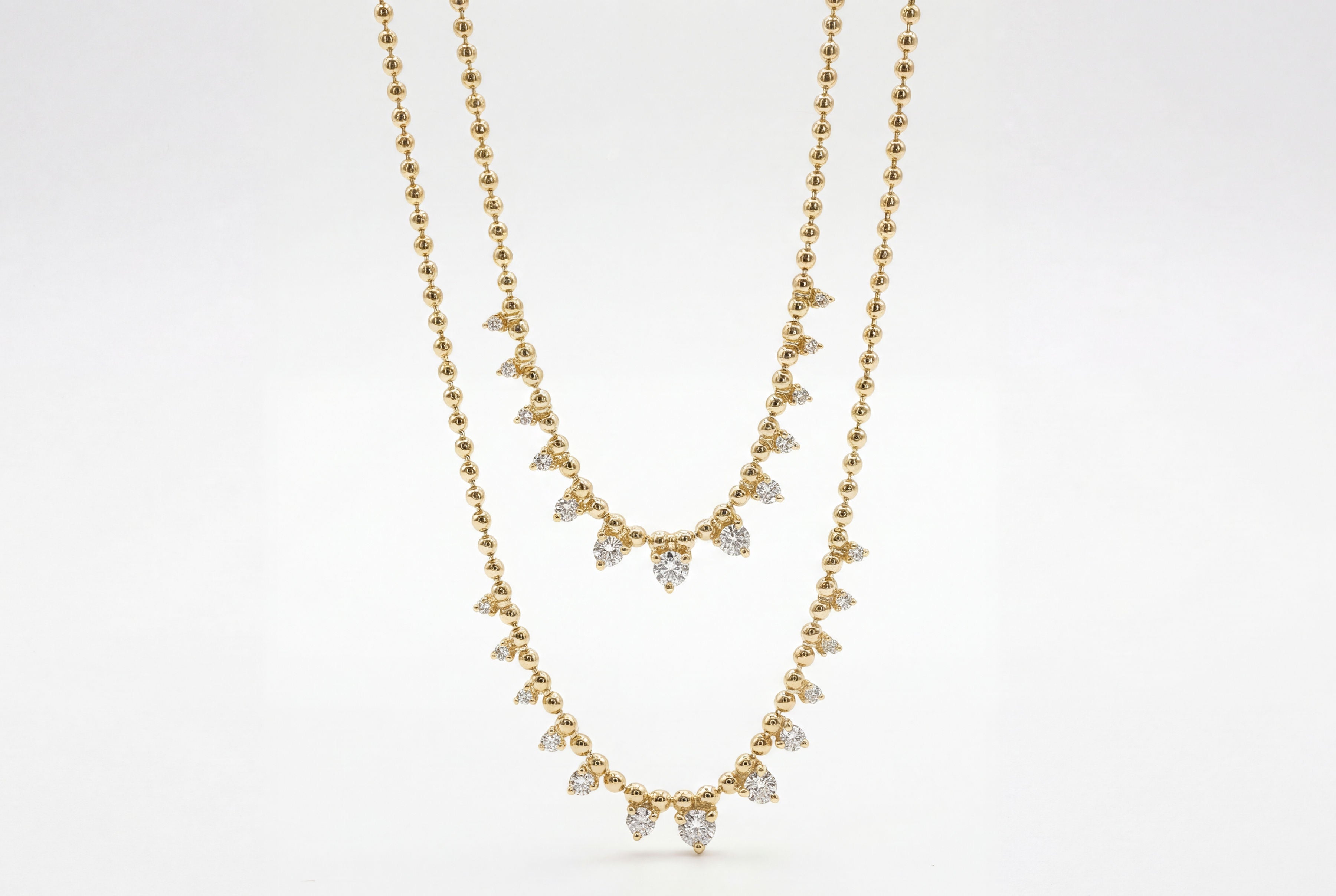 The Radiance Chain combines timeless elegance with contemporary edge. This beaded chain features strategically placed diamond spikes that catch light from every angle, creating a dynamic interplay of brilliance and texture. The carefully calibrated bead-to-spike ratio ensures balanced visual impact without overwhelming the design. Perfect for layering or wearing as a standalone statement piece, this chain transitions seamlessly from day to evening wear. The expert craftsmanship ensures durability while maintaining the delicate sophistication that discerning jewelry enthusiasts demand.