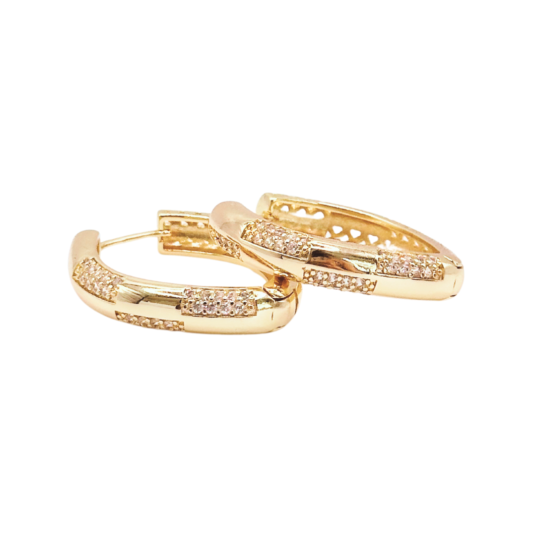 Indulge in a symphony of elegance with our Yellow Gold Pavé Checker Oval Hoop Earrings. Crafted to captivate, these hoops blend classic sophistication with contemporary flair, boasting a stunning checkerboard pattern intricately paved with radiant stones. Elevate any outfit effortlessly, whether it's a casual rendezvous or a glamorous soirée. Embrace luxury and make a statement that's bound to enchant. Plus, they're hypoallergenic, nickel-free, and water-resistant, ensuring both style and comfort in every wear.